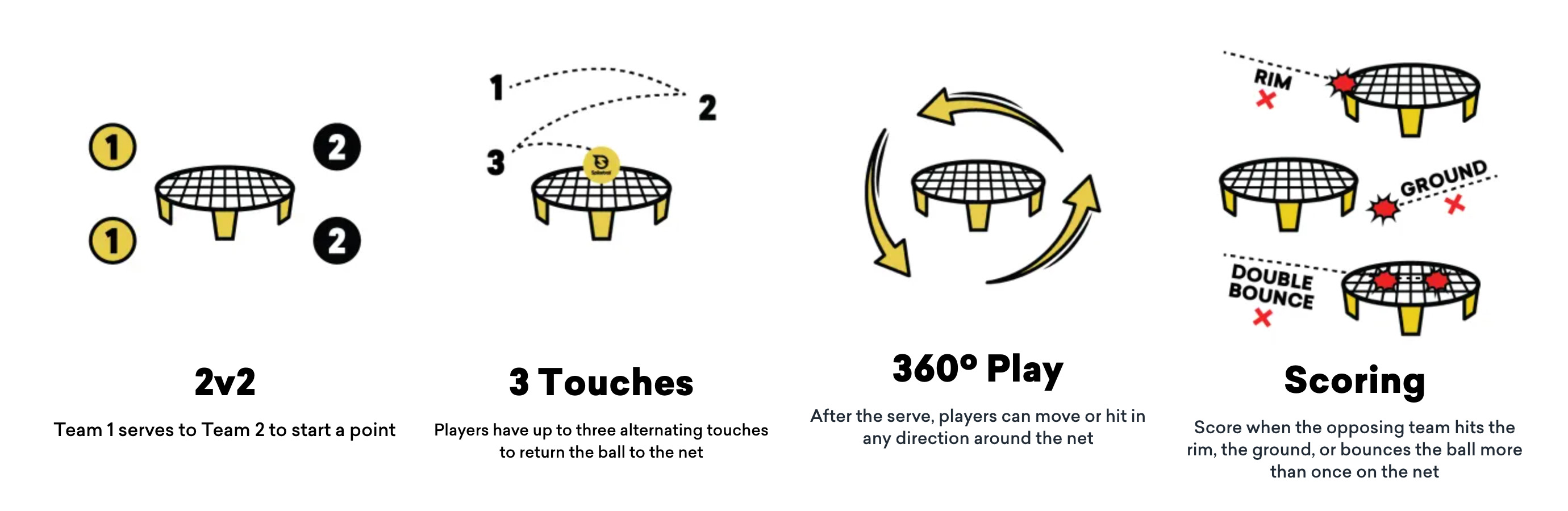 Spikeball is een bal- en netsport waarbij twee teams van elk twee personen een bal naar elkaar kaatsen via een kleine trampoline. Het doel? Voorkomen dat de tegenpartij de bal terugspeelt. De ronde spikeball-trampoline heeft een diameter van net geen meter (of 3 feet) en is strak bespannen met een net. Daarom wordt de sport spikeball ook wel ‘roundnet’ genoemd.