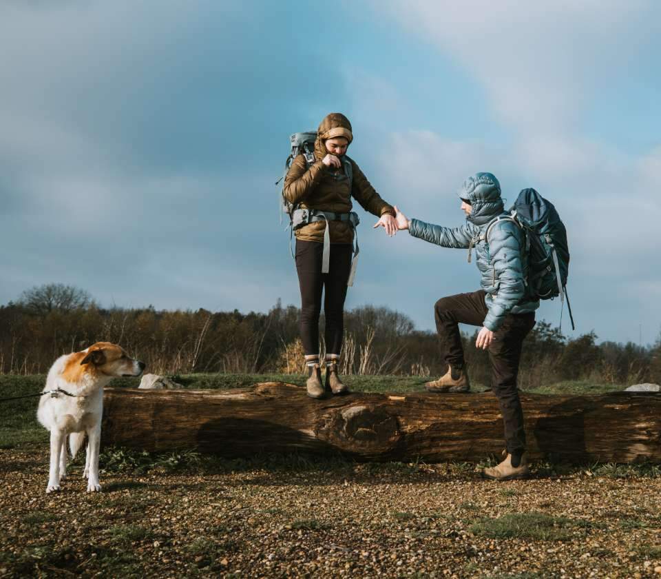 Twee beelden: persoon in donsjas zit op boomstam en speelt met hond; persoon in donsjas zit in open tent met kookmateriaal